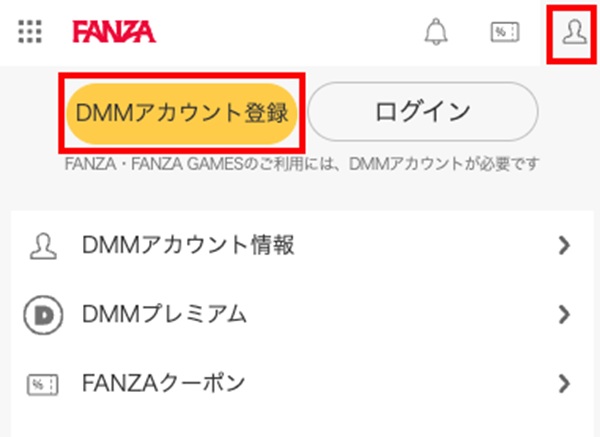 パソコンでもスマホでもたいして画面の差はありません。まずは公式サイトへ行きます。すると右上に人型のアイコンがあります。そこをタップしたりカーソルを合わせたりすると「DMMアカウント登録」ボタンが出現するのでそれをタップ。